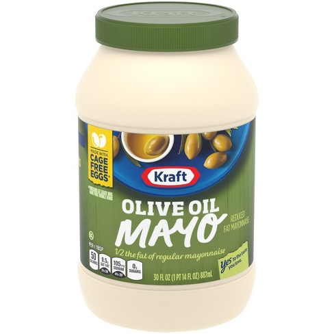Kraft Mayo - Wikipedia Kraft Mayo with olive oil has 50% less fat and fewer calories than regular Kraft Mayo. In 2012, Kraft Mayo Homestyle was produced; a full-fat mayonnaise that is thicker, richer, and slightly more yellow in color than Kraft Mayo. Flavors. Kraft Real Mayonnaise; Kraft Light Mayonnaise-Same as the original version, but with fewer calories and less fat. Kraft Fat-Free Mayonnaise; Kraft Mayo with olive oil-Recent flavor of Kraft Mayo.