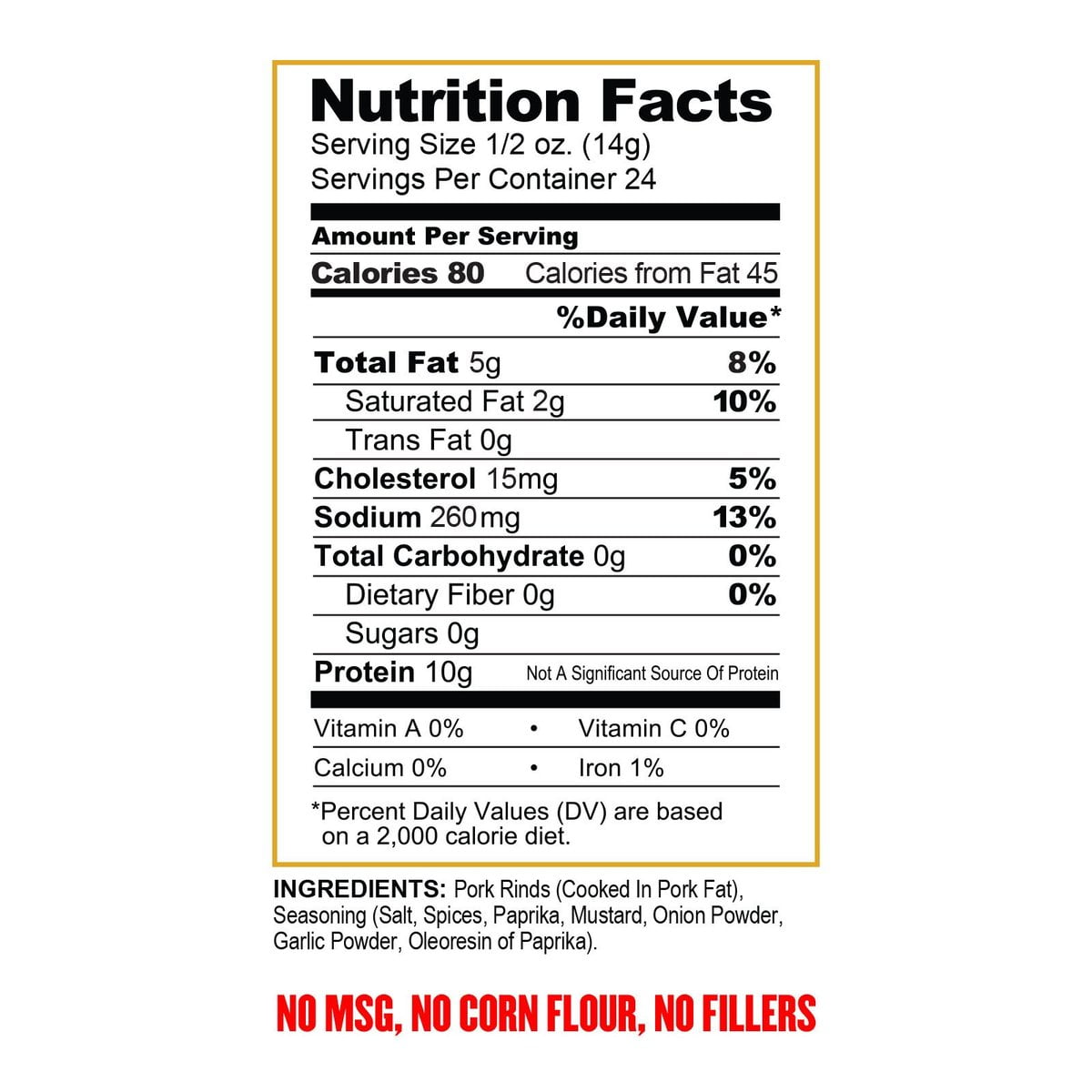 Old Dutch Pork Rinds Bac'n Puffs Allergy and Ingredient Information Nutrition Label Nutrition Facts Serving Size 1.00 Oz Amount Per Serving Calories 80 Calories from Fat 0 % Daily Value* Total Fat 5g 7.69% Saturated Fat 2g 10% Trans Fat 0g Cholesterol 0.015g 5% Sodium 0.23g 9.58% Total Carbohydrates 0g 0% Protein 8g Vitamin A 0% Vitamin C 0% Calcium 0% Iron 0% Mac's BBQ Pork Rinds - Label lists 0 g carbs but there's sugar too On those pork rinds there's probably 4-7% coverage rate. So of 2oz (56 grams) probably 4-7% (1g - 3.9g) is seasoning. Now of that 1g-3.9g of seasoning probably less than 2% of that is sugar, a majority is salt. Source: I make pork rinds 1 View Entire Discussion (4 Comments) More posts from the keto community 1.1k Posted by u/Brandt-son-of-Thora Are Pork Rinds Keto? Pork Rinds Carbs & Recipes - Wholesome Yum Pork rind "panko": These finely ground rinds make a solid swap for breadcrumbs. Pork rinds are often seasoned simply, but look at labels carefully if you follow a clean keto diet to avoid added sugar or other mystery ingredients. Keto Pork Rind Recipes Pin It For Later! Keto Pork Rind Recipes Looking for low carb recipes using pork rinds? How Many Pork Rinds Equal 1 2 Ounce? - VeryMeaty Food manufacturers can list their product as having zero grams of carbs if it contains less than 0.5 g of carbs per serving, thanks to nutrition labeling requirements. In other words, if your pork rinds' ingredient list includes sugar and/or maltodextrin, it's best to presume it has 0.5 grams of net carbs per serving rather than zero.