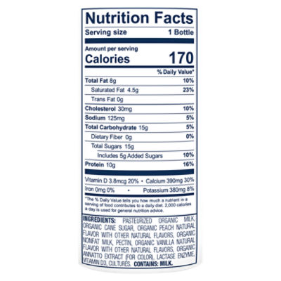 Lifeway Organic Whole Milk Strawberry Kefir, 32 Fl oz - Walmart.com Nutrition facts Refer to the product label for full dietary information, which may be available as an alternative product image. 4 Servings Per Container Serving Size 1 Cup (240mL) Amount per serving Calories 190 * The % Daily Value (DV) tells you how much a nutrient in a serving of food contributes to a daily diet. Calories per gram: