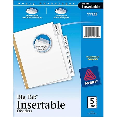 Avery 11124 Insertable Big Tab Dividers, Single 8-Tab Set, Clear-White Avery 11124 Insertable Big Tab Dividers, Single 8-Tab Set, Clear-White Visit the AVERY Store Price: $5.90 Sold as one 8-tab set. Special tab design allows easy insertion and removal, but keeps insert securely in place. Reinforced binding edge. White dividers with clear or multicolor insertable tabs. Avery Big Tab Insertable Dividers, 8-Tab, Clear - LD Products The Avery Big Tab Divider offers tabs and inserts 50% larger than the original tabs. For those who crave neat and tidy organized binders, Avery tabs provide templates on Microsoft word to generate personalized tab inserts using a laser or inkjet printer. Keep everything in your binder neatly labeled and orderly with the Avery double gold ...