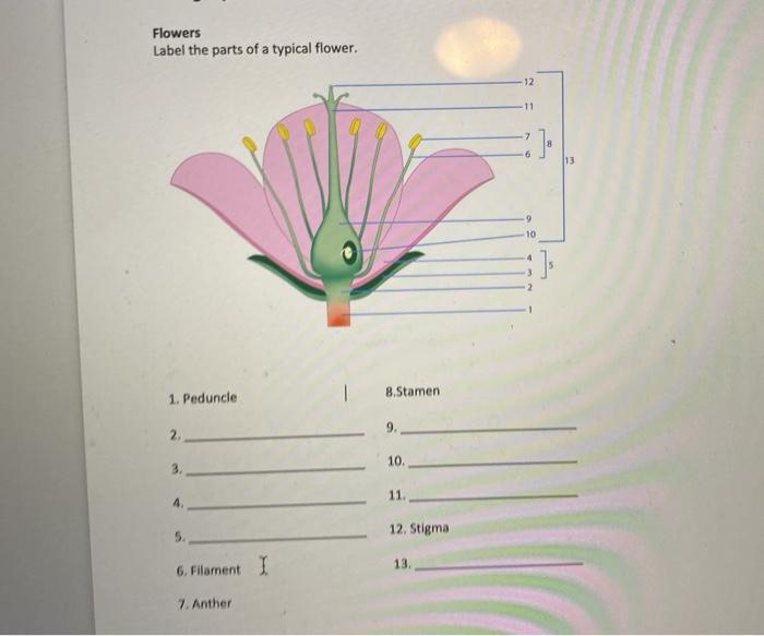 Label the parts of a typical flower: - Byju's Label the parts of a typical flower: A 1 - peduncle, 2 - petal, 3 - sepal, 4 - style, 5 - stigma, 6 - ovary, 7 - pollen sac, 8 - stamen B 1 - receptacle, 2 - petal, 3 - sepal, 4 - style, 5 - stigma, 6 - ovule, 7 - pollen sac, 8 - filament C 1 - pedicel, 2 - sepal, 3 - petal, 4 - stigma, 5 - style, 6 - ovary, 7 - anther, 8 - filament D