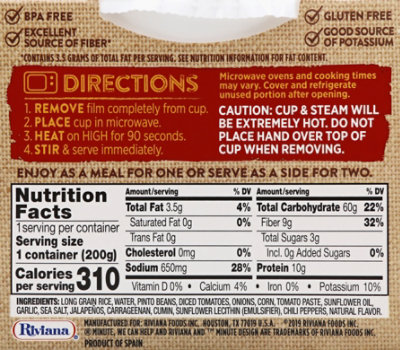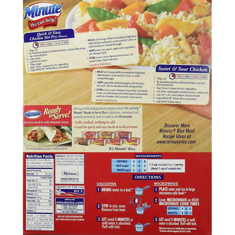 Instant Rice | Microwavable Rice | Delicious Quality ... - Minute® Rice Instant White Rice Instant Premium Rice Instant Rice & Quinoa Instant Jasmine Rice Instant Brown Rice Ready to Serve Cilantro & Lime Jasmine Rice Ready to Serve Garlic & Olive Oil Jasmine Rice Ready to Serve Southwest Pinto Beans and Rice Ready to Serve White Rice Ready to Serve Brown Rice Ready to Serve Jasmine Rice Ready to Serve Basmati Rice Minute Rice Nutrition Label - 1stadenium There are 200 calories in a 12 cup dry 1 cup cooked serving of minute instant white rice. Instant or quickly cooking rice on the other hand is fully cooked and then flash frozen. ... Minute rice nutrition label. The exact nutritional components will vary depending on the rice manufacturer so be sure to read the food label on any rice that you ... Minute® - White Rice - We can help.® White Rice Cooking Directions | Nutrition Facts | Other Information. Since 1949, Minute ® Rice, the original instant rice, has helped families like yours find time to enjoy good meals and good times. Minute White Rice is an enriched, precooked, long grain rice that does not require cooking. Use equal amounts of water or liquid and rice, bring liquid to a boil, add rice and let sit covered for ... Minute Rice, White Rice, Instant Nutrition Facts & Calories - Inlivo Good source of proteins (17% of DV/100g). Relatively high in carbs (28% of DV/100g). This item has no fiber content (0% of DV/100g). Calories in 1 Cup (1.6 oz) 170 calories / 0 from fat Carbohydrates 38 g Proteins 4 g Fat 0 g Saturated Fat 0 g Calories Nutrition Risky Content High Density (3.7 cal/g) Medium Density (5 %/cal) Low Density (0 %/g)