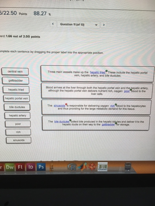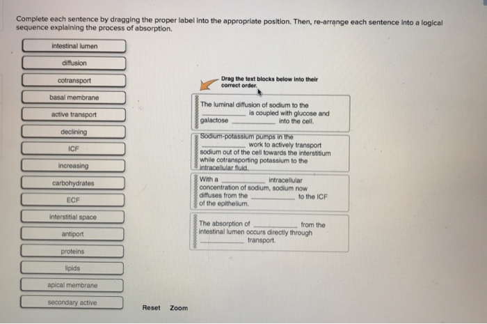 Complete each sentence by dragging the proper label into the appropriate position. Digestive System Flashcards | Quizlet Place a single word into each sentence to make it correct, then arrange each sentence into a logical paragraph order. Word in () is the answer -In the gastric gland, the (chief) cells secrete pepsinogen. -Also in the gastric gland, the parietal cells will secrete (HCl). -HCl will remove some amino acids from pepsinogen and turn it into (pepsin). Complete each sentence by dragging the proper label into the ... Complete each sentence by dragging the proper label into the appropriate position. a. A pH below 7.35 is ACIDOSIS, while a pH above 7.45 is ALKALOSIS. b. The condition of acidosis can cause HYPERKALEMIA because the higher H+ concentration diffuses to the ICF, pushing K+ towards the ECF. c. Solved Complete each sentence by dragging the proper label ... Question: Complete each sentence by dragging the proper label into the appropriate position. Not all options will be used 1. The highest pressure exerted on the arterial walls during the heart cycle is referred to as 2. When one-third of pulse pressure is added to the diastolic pressure, a good estimate of is obtained 3. . 2 Complete each sentence by dragging the labels to the... 2 Complete each sentence by dragging the labels to the appropriate blanks. Then place each sentence in a logical order beginning with blood. entering the right side of the heart. Drag the text blocks below into their correct order. tricuspid valve 00:43:30 The bring oxygenated blood back to. the of the heart. bicuspid pulmonary veins Blood then ...