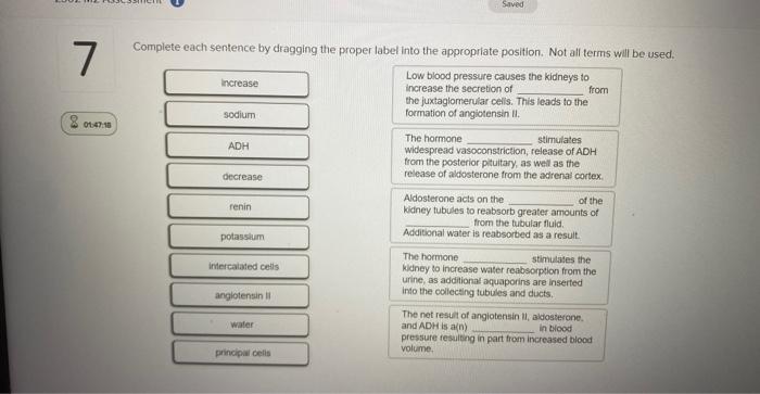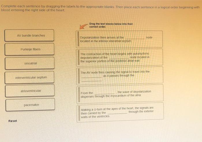 . 2 Complete each sentence by dragging the labels to the... 2 Complete each sentence by dragging the labels to the appropriate blanks. Then place each sentence in a logical order beginning with blood. entering the right side of the heart. Drag the text blocks below into their correct order. tricuspid valve 00:43:30 The bring oxygenated blood back to. the of the heart. bicuspid pulmonary veins Blood then ... Solved Complete each sentence by dragging the proper label ... Question: Complete each sentence by dragging the proper label into the appropriate position. Not all options will be used 1. The highest pressure exerted on the arterial walls during the heart cycle is referred to as 2. When one-third of pulse pressure is added to the diastolic pressure, a good estimate of is obtained 3. Complete each sentence by dragging the proper label into the ... Complete each sentence by dragging the proper label into the appropriate position. a. A pH below 7.35 is ACIDOSIS, while a pH above 7.45 is ALKALOSIS. b. The condition of acidosis can cause HYPERKALEMIA because the higher H+ concentration diffuses to the ICF, pushing K+ towards the ECF. c.